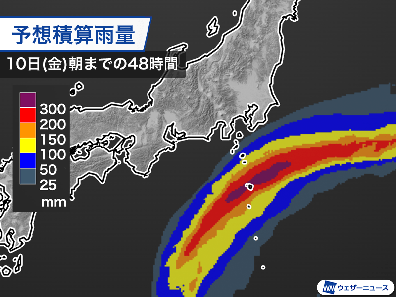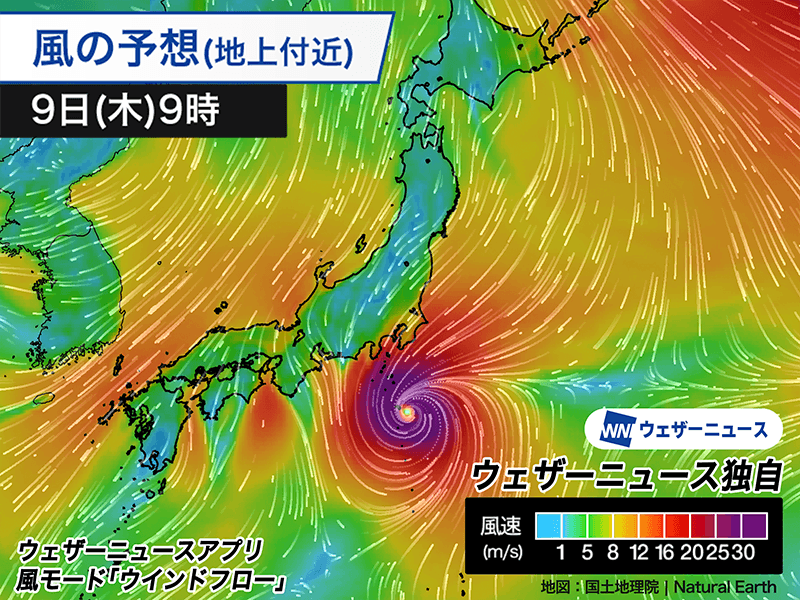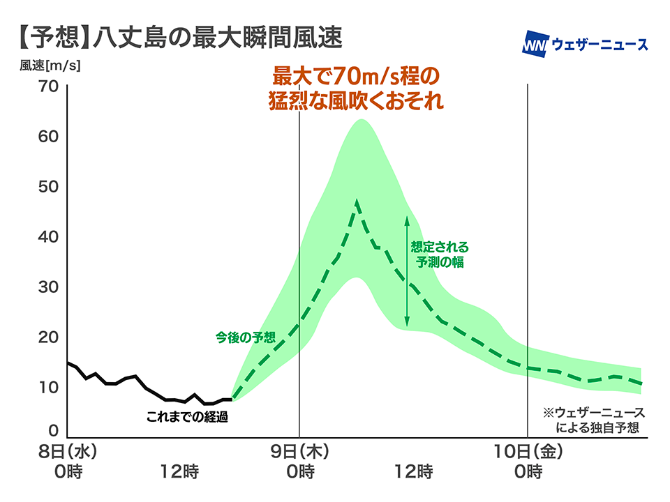 伊豆諸島では南部を中心に、9日(木)は最大瞬間風速70m/sという建物が損壊するほどの記録的な暴風が吹くおそれがあります。