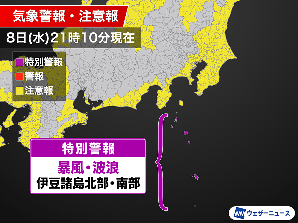 この先もしばらく非常に強い勢力を維持したまま、9日(木)3時〜9時の間に八丈島や青ヶ島などの付近を通過する可能性が高まっています。
