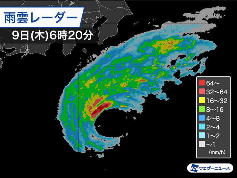 伊豆諸島南部付近では非常に激しい雨が降り続き、3時間に150mm近い雨、東京都八丈町付近では5時30分までの1時間に120mm以上の猛烈な雨が降ったとみられています。