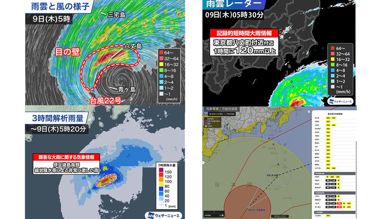 9日(木)未明になり伊豆諸島南部が平均風速25m/s以上の暴風域に入り、八丈島では6時までに54.7m/sの最大瞬間風速を観測。八丈島で50m/s以上の暴風を観測したのは2005年以来、20年ぶりです。また、台風の目を取り囲む活発な「壁雲」がかかり、八丈島では24時間雨量が300mmを超えました。
