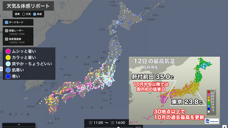 九州は三連休の2日目の12日(日)も真夏のような暑さになりました。鹿児島県では35℃に到達し、観測史上最も遅く、10月中旬以降では国内で初めての猛暑日を観測しました。ウェザーニュース for businessの「天気&体感リポート」メニューの11時〜14時の体感報告に注目してみると、九州では「カラッと暑い」や「ムシッと暑い」の体感報告が目立ち、関東では「さわやか・ちょうどいい」北日本では「肌寒い」の報告が多くなっていました。