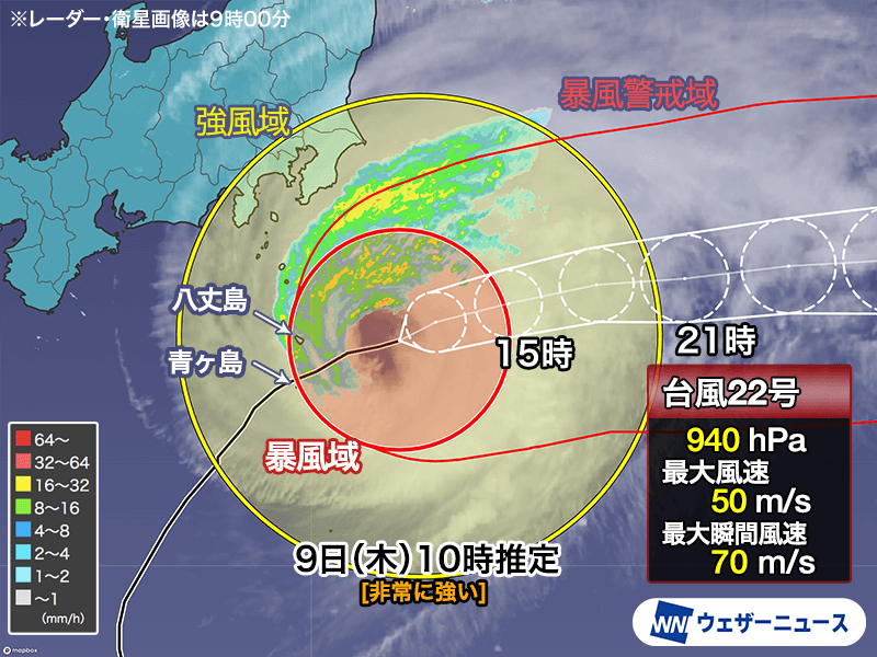 台風22号(ハーロン)は、高気圧の縁に沿って東北東に進んでいます。9日(木)未明に伊豆諸島南部が平均風速25m/s以上の暴風域に入り、八丈島では5時24分に54.7m/sの最大瞬間風速を観測しました。八丈島で50m/s以上の暴風を観測したのは2005年以来、20年ぶりです。