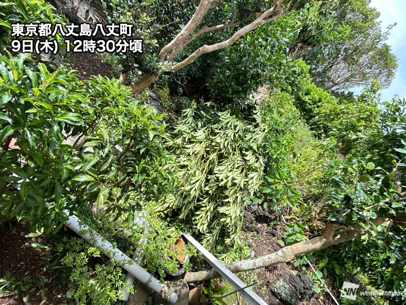 大雨のピークは越えて日差しも届き始めていますが、これまでに降った雨の影響で八丈島では土中水分量が多くなっていて、土砂災害などの危険性が高くなっています。八丈町では広範囲で多発的な土砂災害が発生するおそれがあり、大雨特別警報が発表継続中です。