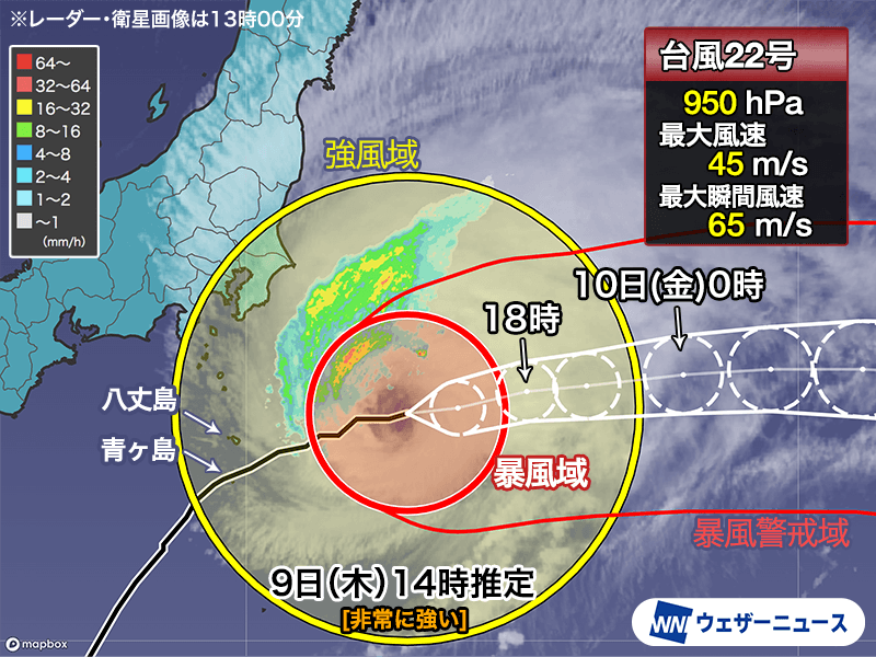 台風22号(ハーロン)は、今日9日(木)の明け方から朝に伊豆諸島に最も接近しました。台風の目を取り囲む活発な「壁雲」がかかっていた八丈島では、54.7m/sの最大瞬間風速を観測。八丈島で50m/s以上の暴風を観測したのは2005年以来、20年ぶりです。