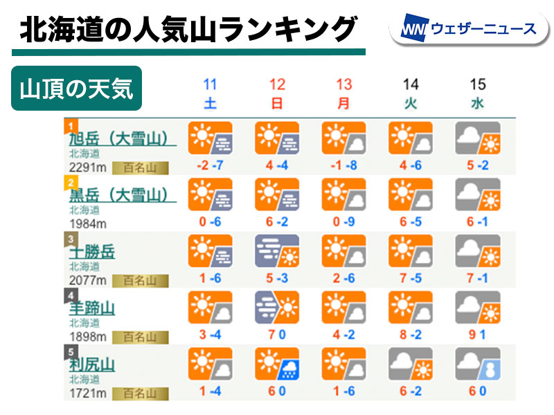 高気圧に覆われます。このため、全道的に晴れて登山日和となるところが多い見込みです。午後は道南方面を中心に薄雲が広がることもありますが、夕方にかけては大きな天気の崩れはないと見ています。朝晩は冷え込みが強まり、-5℃を下回る山もあります。日中も気温は一桁台です。防寒対策を万全に。