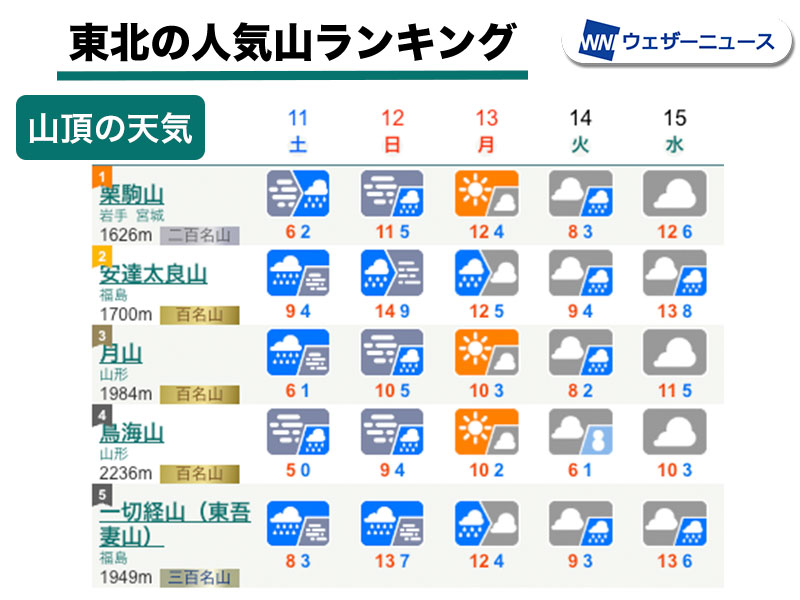低気圧や湿った空気の影響を受けます。早池峰山や八甲田山、岩木山など、紅葉の見頃を迎えている北部の山域では午前中は晴れ間がありますが、次第に雲が厚くなる見込みです。蔵王や月山、吾妻連峰など南部の山域では天気は下り坂となり、午前中から冷たい雨が降り出す見込みです。なお、早朝は霜が降りるほどの冷え込みになるため、調節しやすい服装がおすすめです。