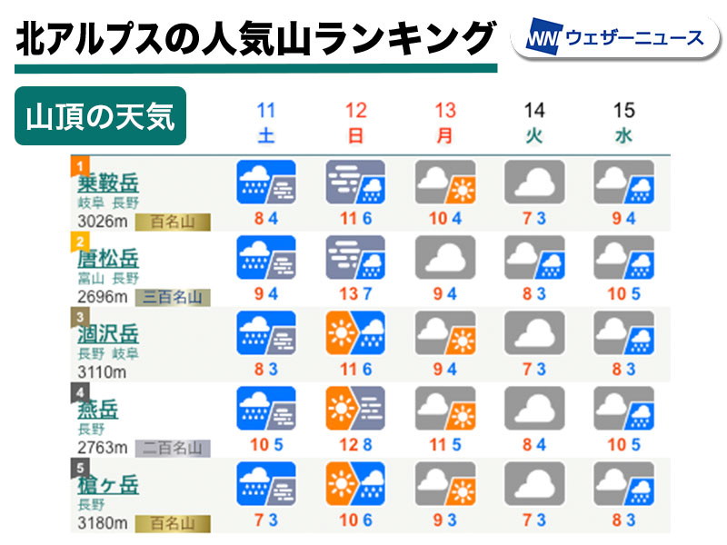 低気圧や湿った空気の影響を受けます。全般に曇りや霧となる山域が多く、雨の降る所もあるでしょう。特に北関東や東海西部では雨が降りやすいと見ています。