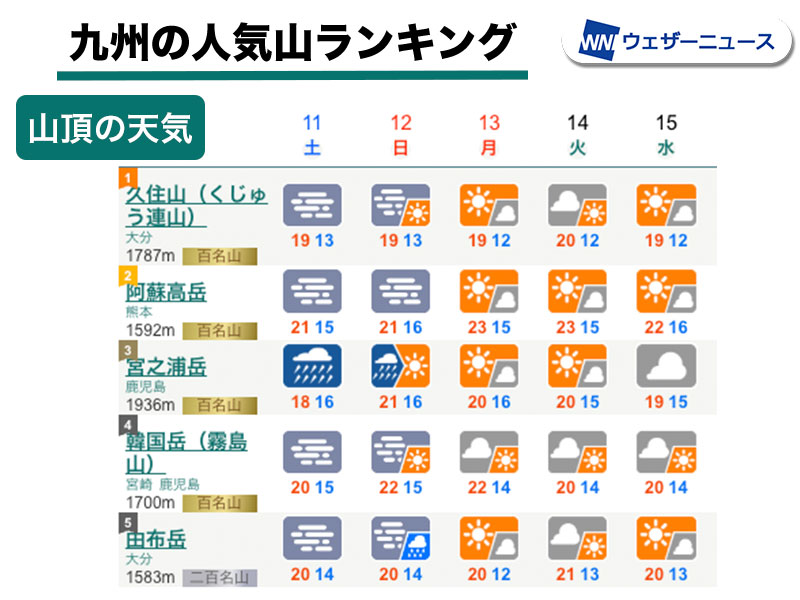 高気圧に覆われます。このため、四国、九州の山域では、晴れる所が多くなるでしょう。一方、大峰や大台ヶ原などの近畿地方南部の山地では、東よりの湿った気流の影響で雲の多い天気となりそうです。また、大山や氷ノ山などの中国地方の山域では、朝は北寄りの湿った気流の影響が残り、雨が降る可能性がありますが、日中は次第に回復傾向となる見込みです。