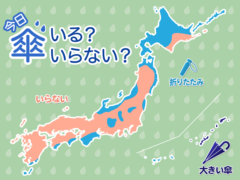 西日本太平洋側や先島諸島、本州の一部地域でもにわか雨の可能性があり、北陸でも夜遅くに雨の降る所があるとみています。また、紀伊半島では雷を伴った降り方の強まりにも注意が必要です。