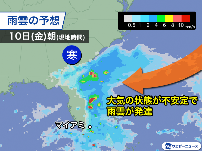 局地的には雨雲が発達して、現地時間の10日(金)にかけて80〜100mmの雨量に達する所がある見込みです。中小河川の増水や低い土地での浸水などのおそれがあるとして、気象当局は注意を呼びかけています。