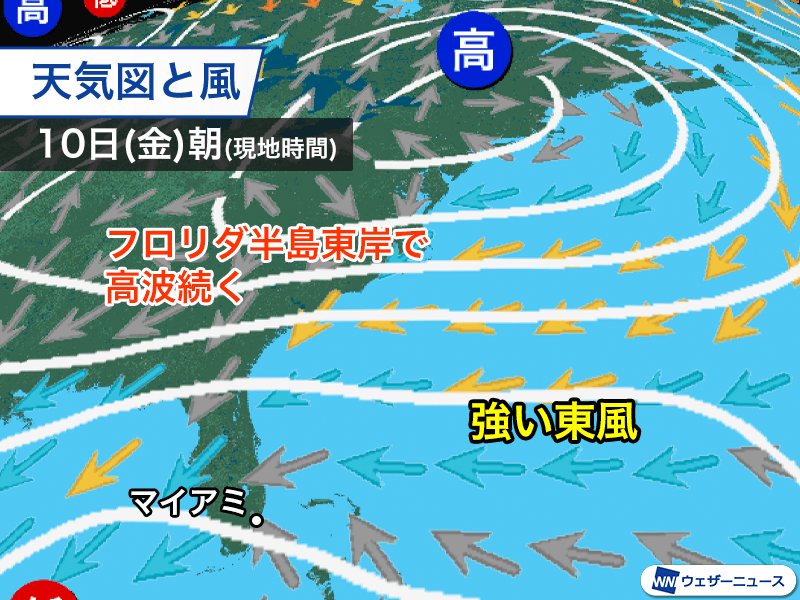 北アメリカの北部に中心をもつ優勢な高気圧の南の縁に沿って、強い東寄りの風が吹いています。大西洋から長い距離を経てフロリダ半島に風が吹き付け、沿岸部では高波となる見込みです。