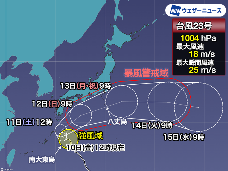 台風23号は北上した後、北から東へと進路を変え、12日(日)から13日(月)・スポーツの日は暴風域を伴って本州の南の海上を進む見通しです。
