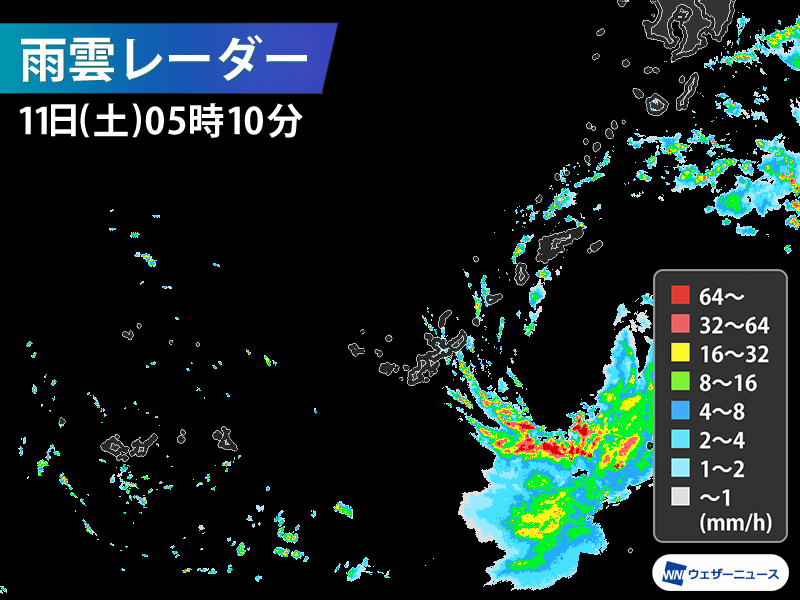 台風の中心が近づく鹿児島県の種子島・屋久島地方などでは、台風本体の活発な雨雲がかかる可能性があり、激しい雨や強風に注意が必要です。