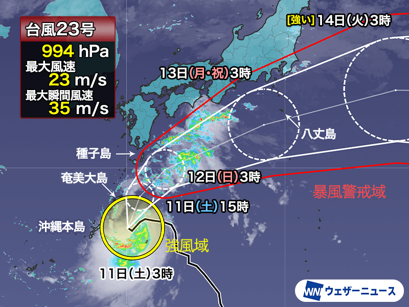 台風23号は発達しながら、12日(日)夜〜13日(月)朝にかけて伊豆諸島南部に接近する可能性があります。