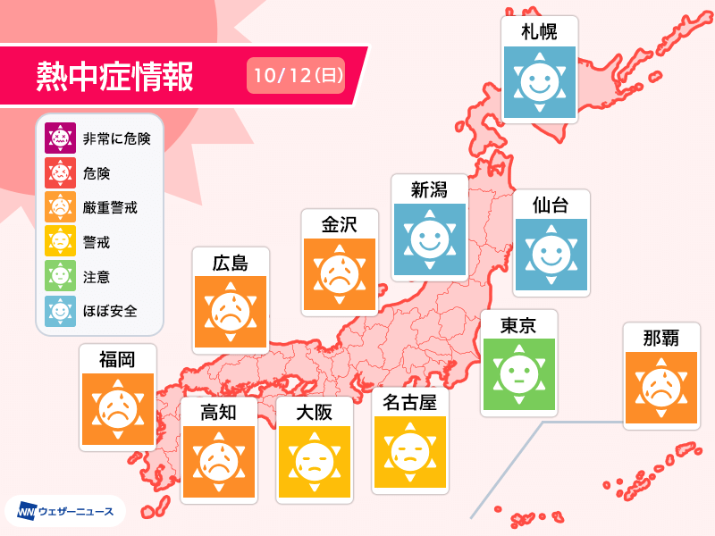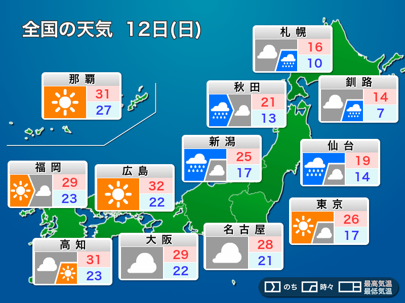 九州や中国・四国は晴れる所が多く、昼間は気温が上がります。30℃以上の真夏日の所もあり、季節外れの暑さが続く見込みです。熱中症に引き続きお気をつけください。