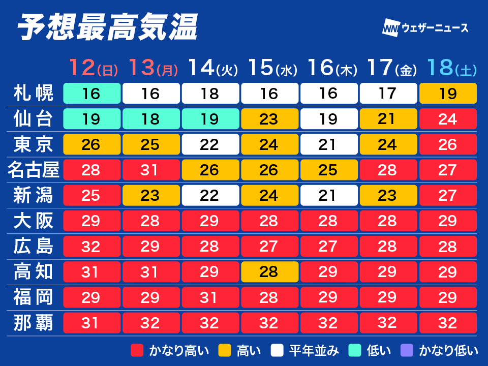 最高気温は30℃前後まで上がり、日差しがしっかり届くと真夏日になる日があります。福岡市は14日(火)、高知市では明日12日(日)と13日(月・祝)が真夏日の予想です。