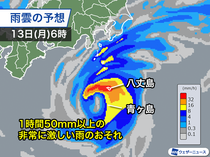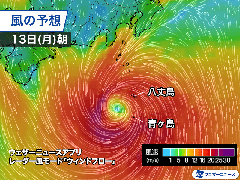 台風は強い勢力で伊豆諸島付近を通過する見通しで、中心が近くを通った場合は瞬間的に40m/s前後の暴風が予想されます。