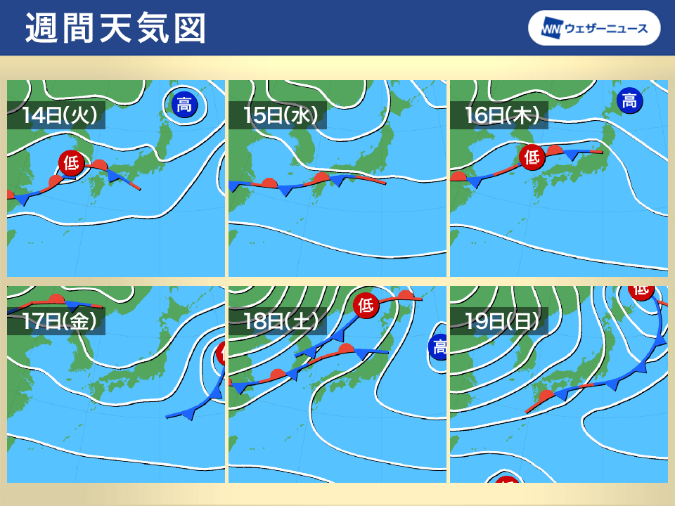さらに、16日(木)は再び前線上の低気圧が西から接近し、西日本〜東北の各地で雨の降る可能性があります。短い周期で天気が崩れるので、洗濯物の外干しや布団干し、屋外作業などは計画的に。