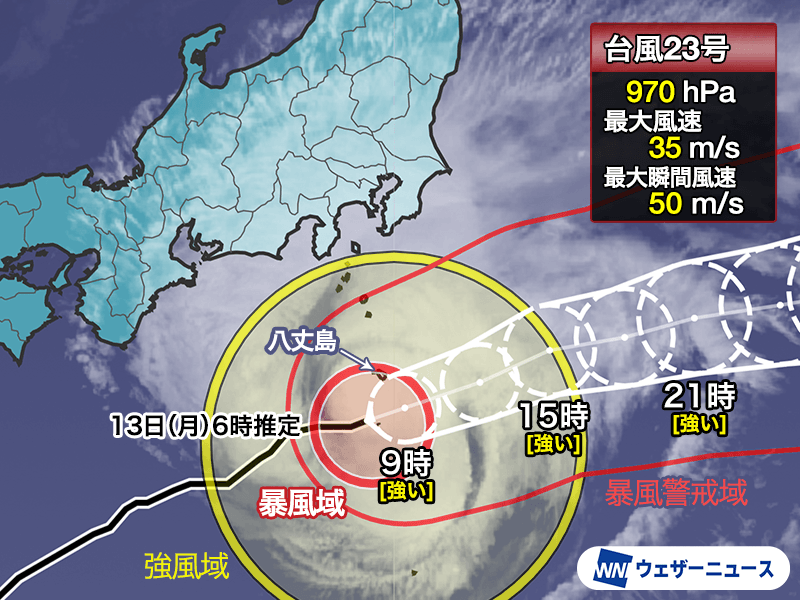 強い台風23号(ナクリー) まもなく八丈島に最接近 42.7m/sの暴風観測