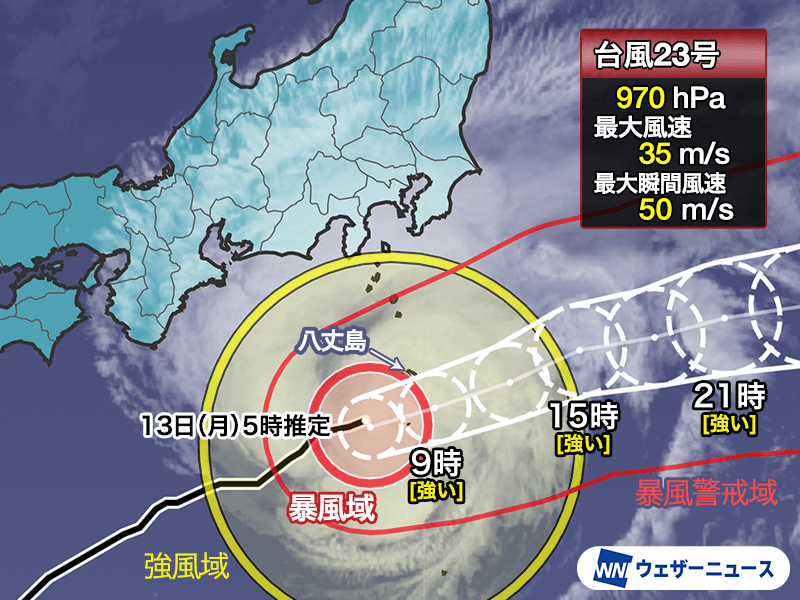 台風23号(ナクリー)は明日13日(月)朝に伊豆諸島南部に最接近する予想です。伊豆諸島では今夜から明日午前中を中心に大荒れとなります。激しい風雨となるおそれがあるため警戒してください。