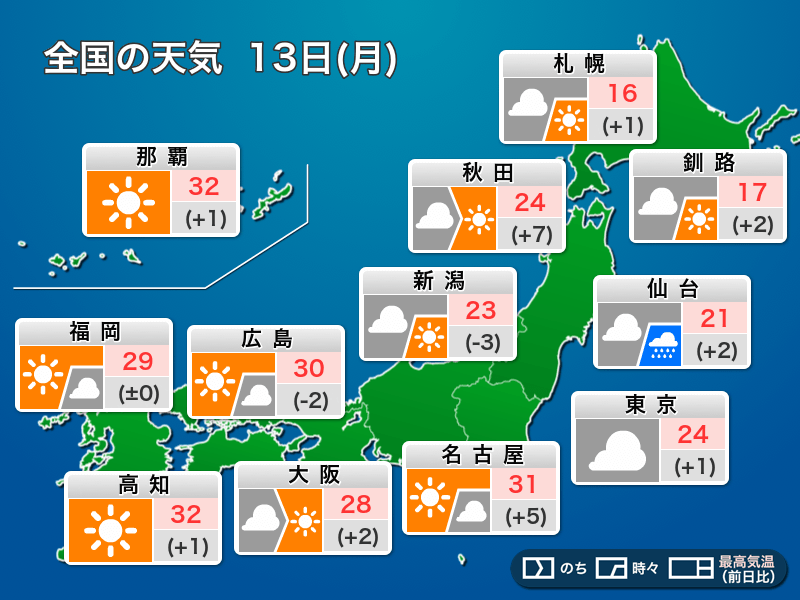 今日10月13日(月)スポーツの日の天気予報