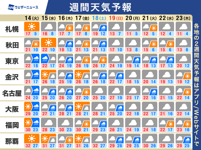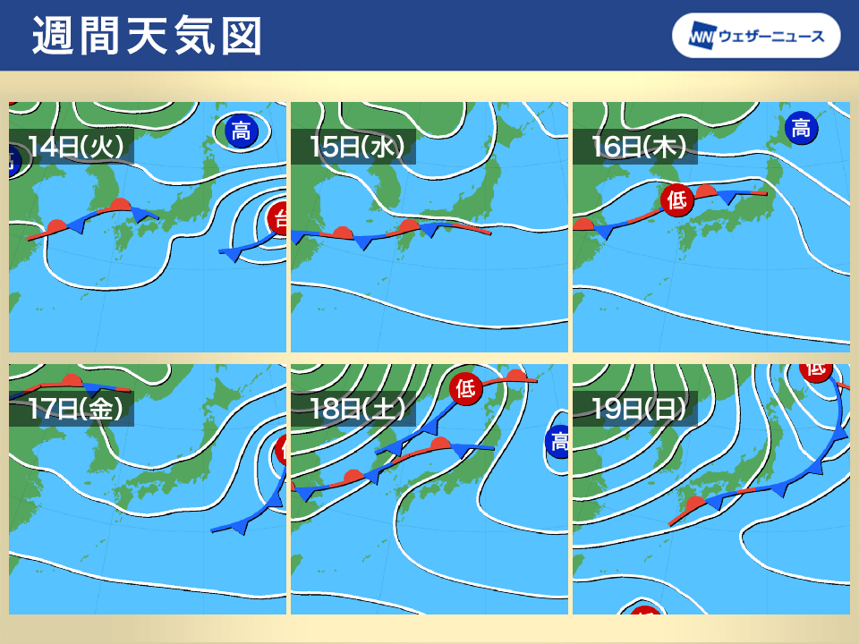 さらに18日(土)〜19日(日)には、前線を伴った低気圧が北日本を通過し、寒冷前線が通過することで広範囲で天気が崩れる可能性があります。次の週末もお出かけにはあいにくの天気となるかもしれません。