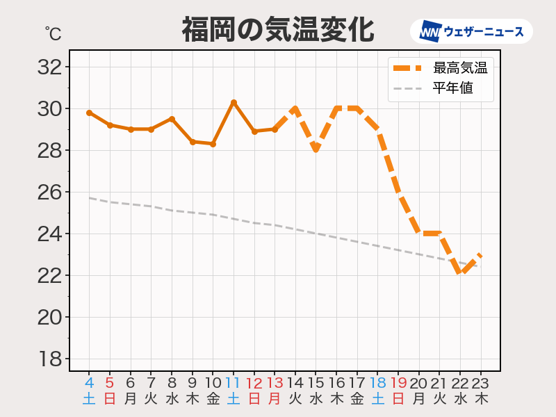西日本ではあと1週間程度は気温が平年よりも高い状態が続く見通しです。寒冷前線が通過したあとは暖気の北上が抑えられるため、来週になると秋らしさが増して昼間も過ごしやすくなってきそうです。