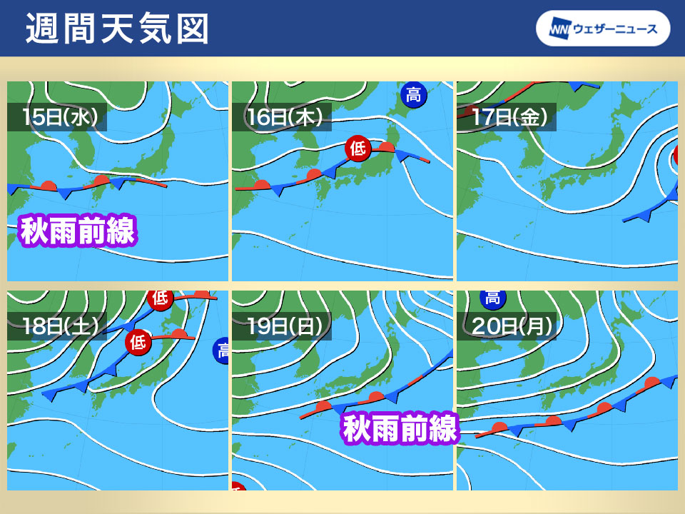 さらに、16日(木)は秋雨前線上の低気圧が西から接近し、西日本〜東北の各地で雨の降る可能性があります。短い周期で天気が崩れるので、洗濯物の外干しや布団干し、屋外作業などは計画的に。