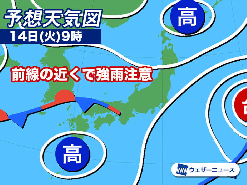 明日14日(火)は大陸から東に進む前線が南下しながら本州付近に接近します。東北南部や西日本や東日本では日本海側から雨のエリアが広がっていき、午後は太平洋側でも本降りの雨となります。