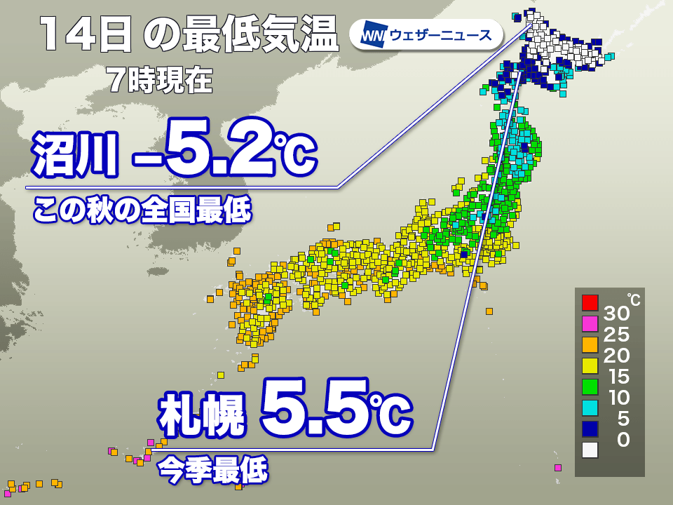 道央の札幌市でも5.4℃を観測し、今季最低気温を更新しています。