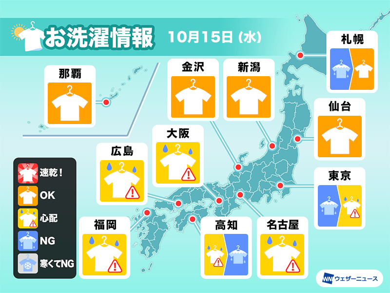 東北や北陸は前線が南に離れるため雨の可能性は低くなり、洗濯のチャンスとなりそうです。明日は広範囲で雨が予想されるため、外干しは計画的に。