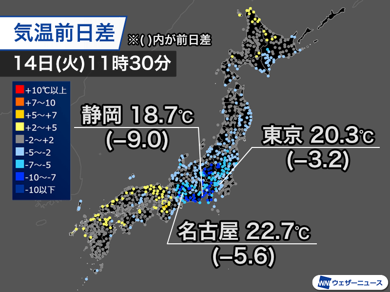 日差しが届かないことで昼近くなっても気温が上がらず、昨日の同じ時間帯よりも大幅に低くなりました。11時30分の気温は静岡市で昨日の同じ時刻より9.0℃低い18.7℃、名古屋市は5.6℃低い22.7℃、東京都心は3.2℃低い20.3℃となっています。