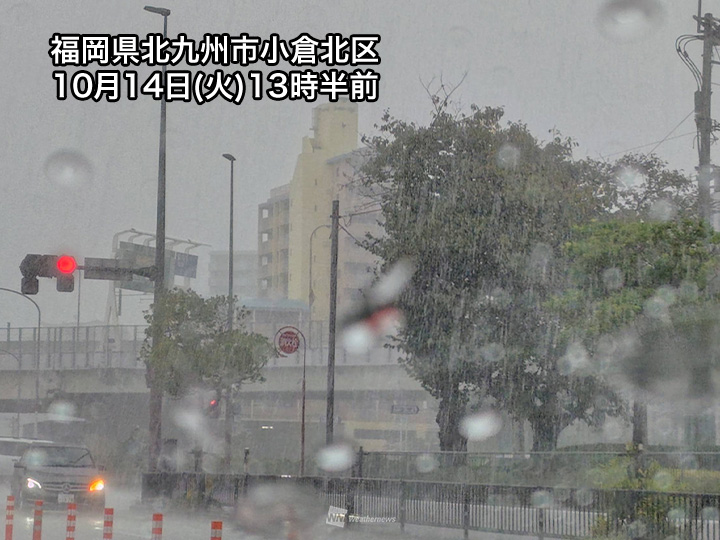 長崎県壱岐や福岡県、山口県の一部で雨が強まっていて、13時30分までの1時間には壱岐市・石田で35.5mmの激しい雨、山口県長門市・油谷で11.5mmのやや強い雨を観測しました。活発な雨雲の周辺では雷が頻発している状況です。