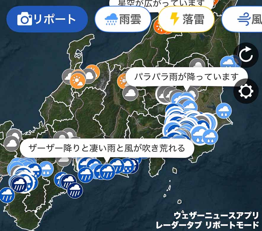 周辺からの天気投稿「ウェザーリポート」をアプリで見る周辺からの天気投稿「ウェザーリポート」