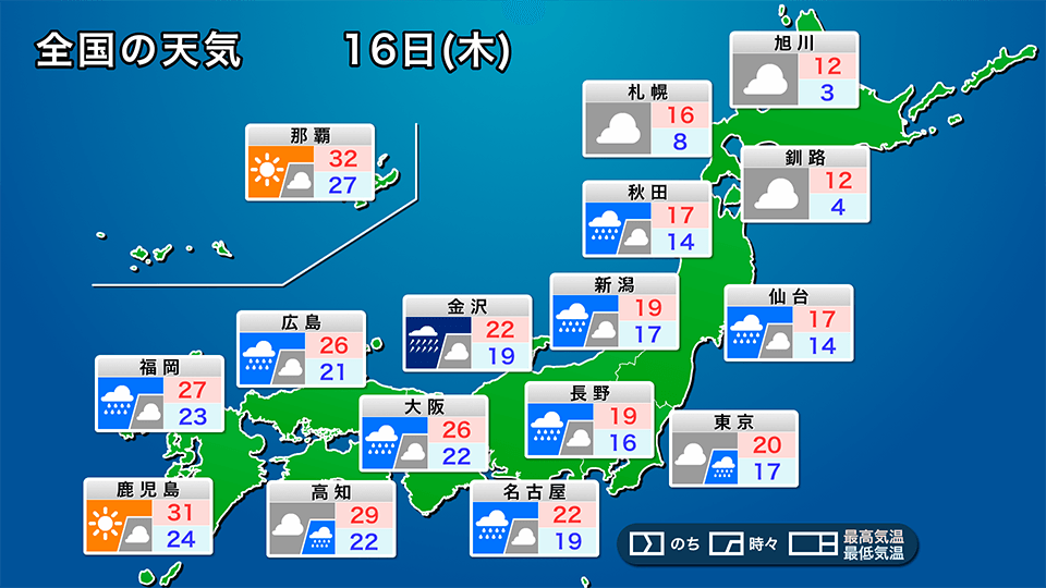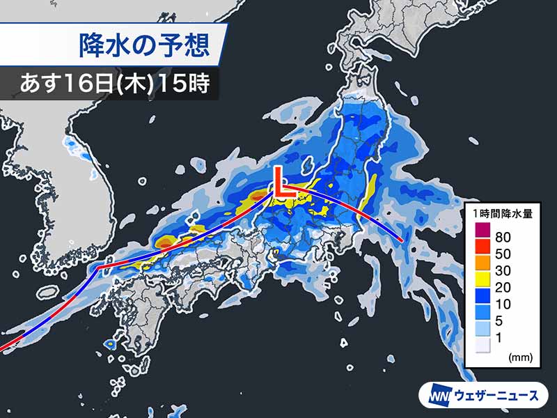 明日16日(木)は広範囲で雨 低気圧接近する北陸は大雨のおそれも
