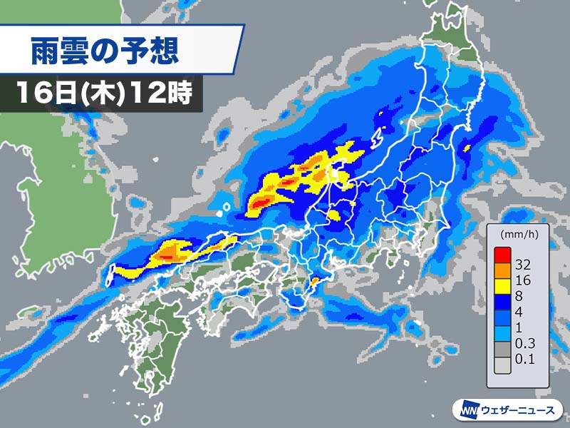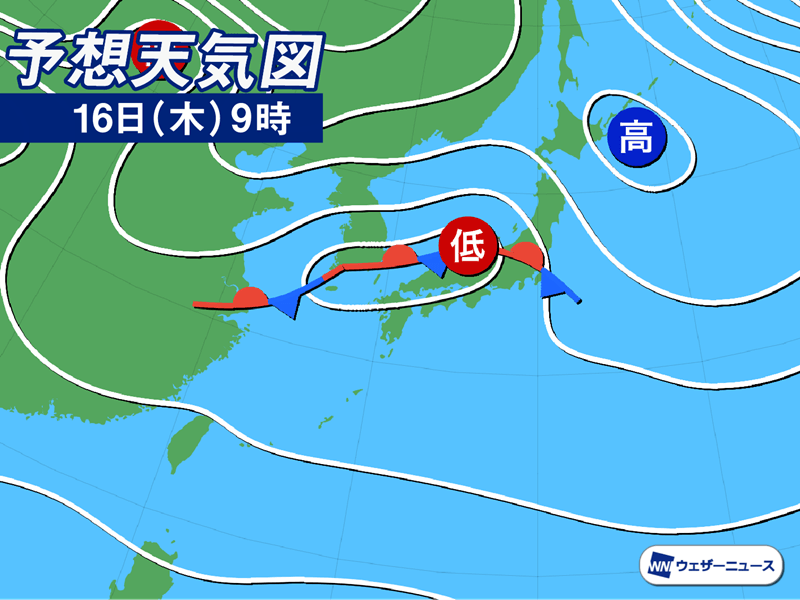 明日16日(木)は低気圧前線が通過 北陸は強雨や大雨のおそれ