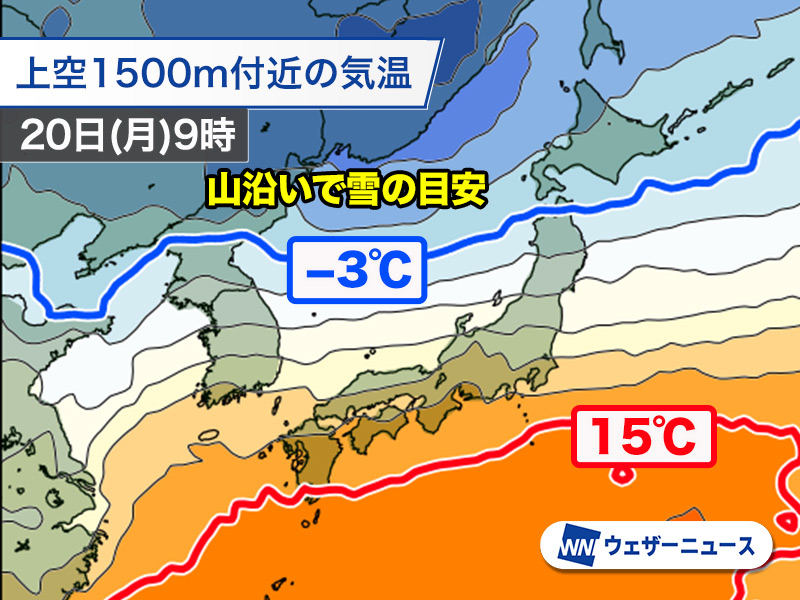 寒冷前線の通過後には西高東低の気圧配置となり、上空には寒気が南下します。北海道の上空約1,500mには−3℃以下の寒気が流れ込み、山沿いでは降水があれば雪になる可能性があります。来週の北海道は最高気温が10℃台前半の日が多くなり、晩秋を感じさせる寒さとなります。