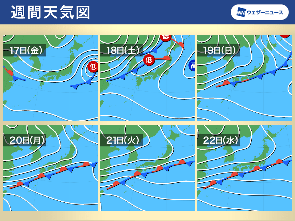 18日(土)〜19日(日)にかけて、発達しながら低気圧が日本海から北海道の北へ進み、低気圧からのびる寒冷前線が日本列島を通過することで広範囲で雨が降る予想です。週末はあいにくの天気となり、お出かけの際は雨具の準備が必要です。