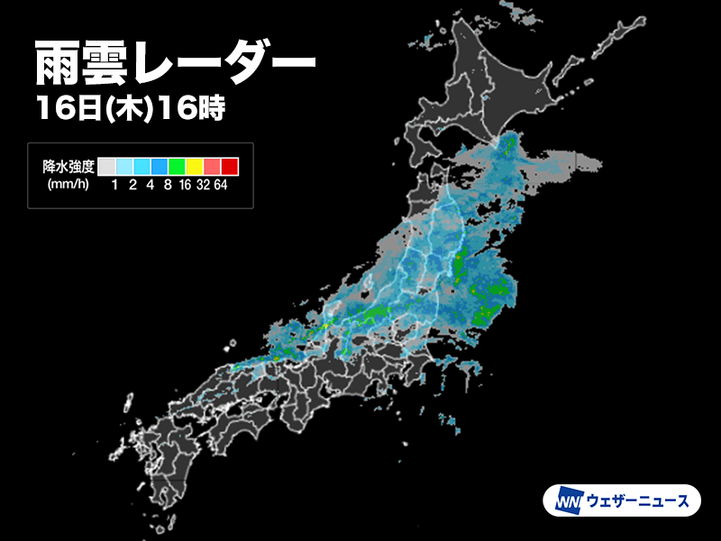 16時までの1時間には、富山県の朝日と宇奈月で18.0mmの雨量を観測しています。午後になって特に北陸周辺で雨が強くなりました。