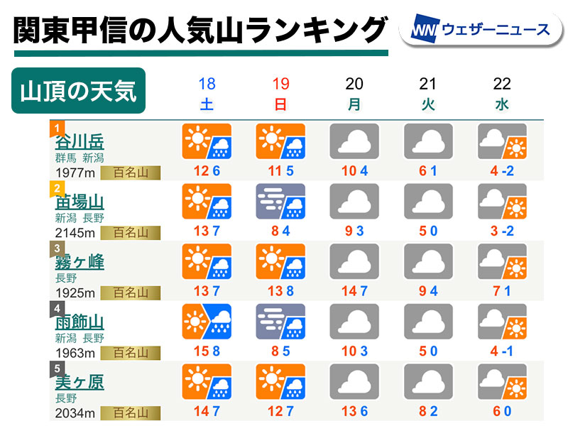 日本海側では、湿った北寄りの気流の影響で下層雲がかかり、妙高山の周辺などでは午前を中心に雨が降りやすくなります。ただ、標高2000m以上では雲が届かず、青空がのぞく可能性があります。北アルプスでは、雲が多い天気となりますが、大きな天気の崩れはない見込みです。