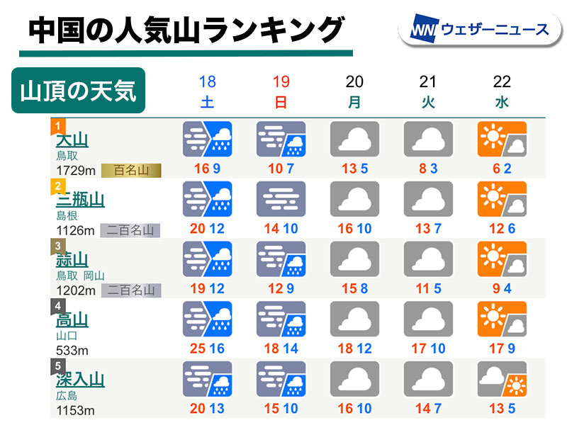 また、大山や蒜山、氷ノ山では、一日を通して湿った北東風の影響で雨が降ったり止んだりとなる見込みです。視界不良にも注意が必要です。