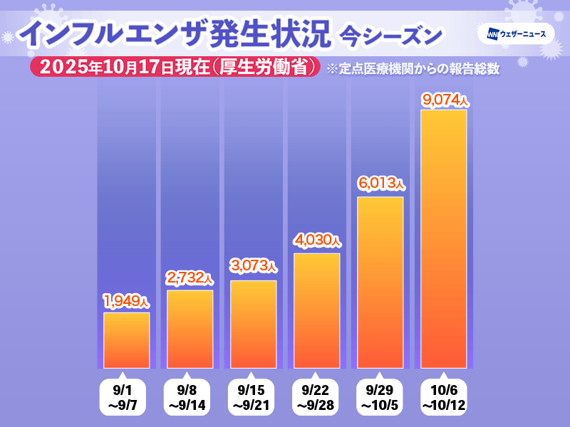 インフルエンザ患者数は9000人超え 昨年より1か月早いペース