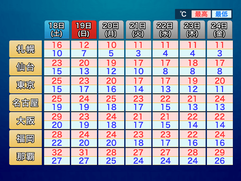 こうした状況は24日(金)頃まで続くとみられます。寒気の南下によって、西日本などに季節外れの残暑をもたらしていた暖気も南に後退するため、全国的にこれまでよりも気温が下がる予想です。