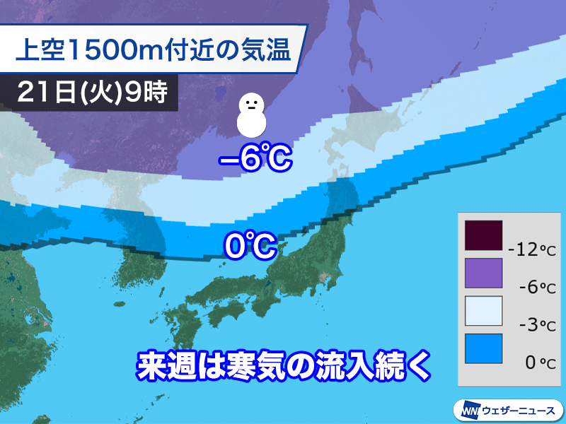 20日(月)頃から北日本の上空に寒気が流れ込んできます。平地で雪の降る目安となる上空1500m付近で−6℃以下の寒気が北海道の道北まで南下し、山で雪の降る目安の0℃以下の寒気は東北まで覆う見込みです。