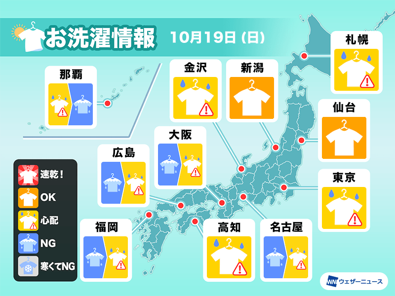 北海道の日本海側は雨が降りやすく、外干しには不向きな空です。北海道の太平洋側や東北は天気が回復して秋空が広がるため、洗濯物の外干しができそうです。