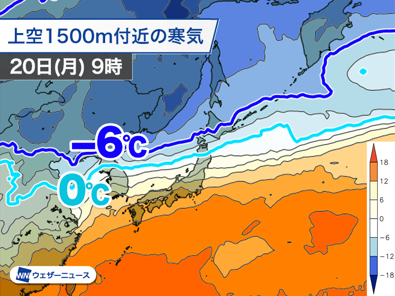 この後は、北日本を中心に冬型の気圧配置が続き、道北付近には上空約1,500mで-6℃以下の寒気が流れ込みます。この寒気の影響を受け、日本海側やオホーツク海側の地域を中心に天気の崩れる所が多く、沿岸部ではあられや雷に注意が必要です。