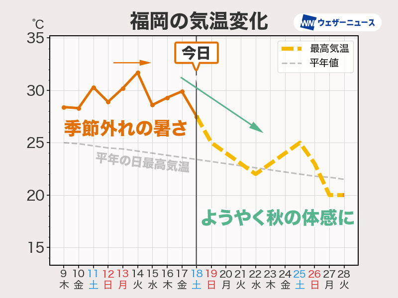 南岸に停滞する前線の影響で、本州は秋の空気に包まれます。これまで季節外れの暑さが続いていた西日本は、ようやくこの時期らしい過ごしやすい気温になりそうです。東日本も一層秋らしさを感じられる日が多くなり、秋服が活躍します。