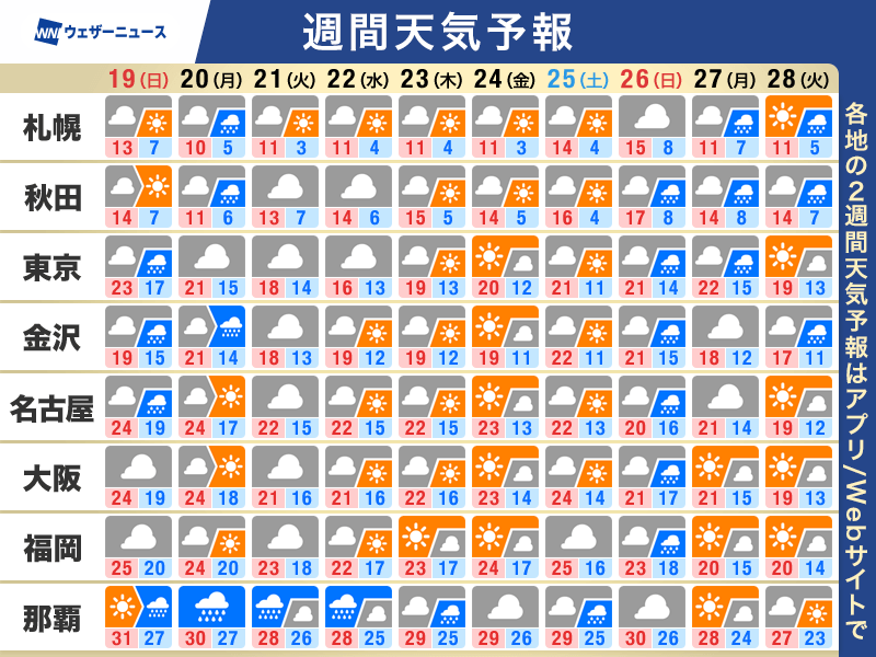 北日本では寒気が南下する影響で、東北は秋が深まり紅葉の色づきも進みそうです。北海道は初冬の寒さで、札幌などでも最高気温が10℃前後の日が多くなる予想です。