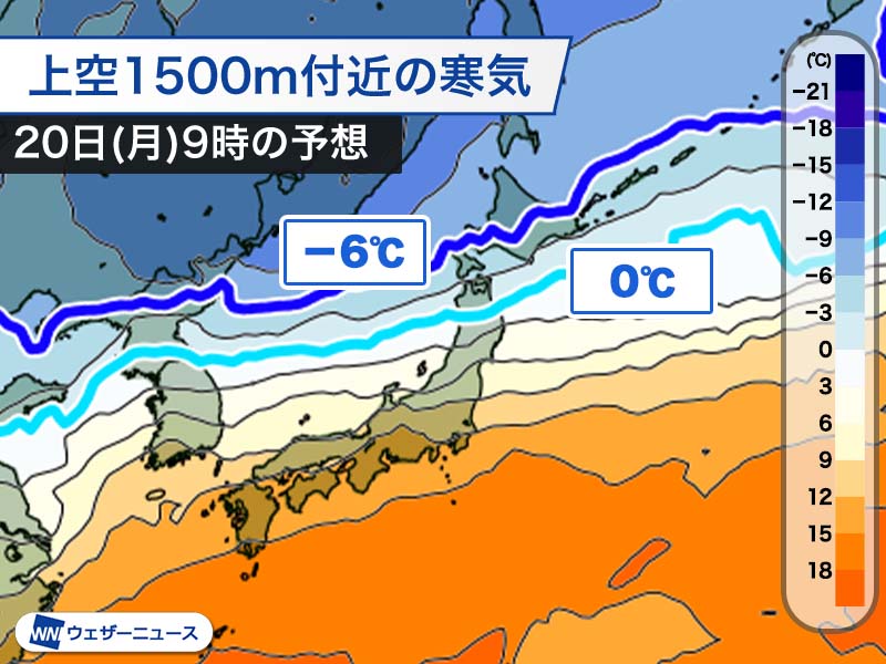 20日(月)頃から北日本の上空に寒気が流れ込んできます。