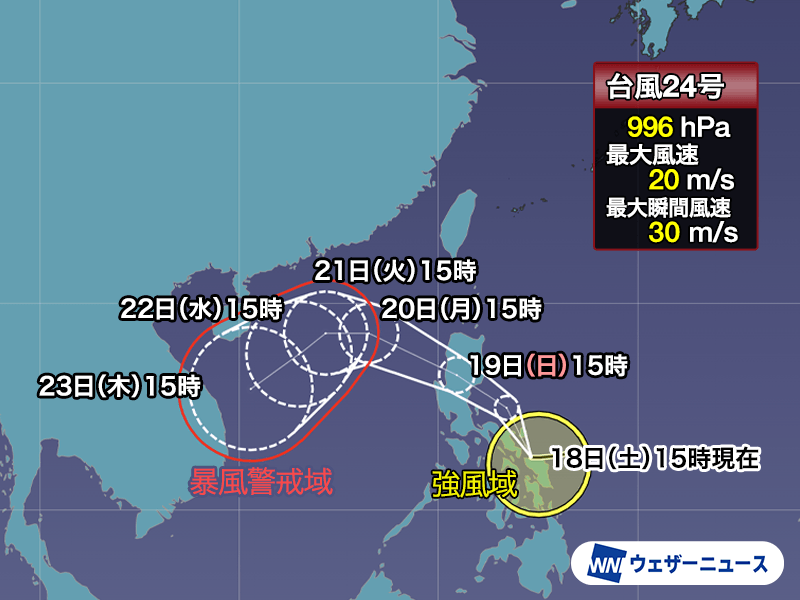 台風24号は沖縄〜日本の南に位置する亜熱帯高気圧の縁に沿って西進しています。明日19日(日)にフィリピンのルソン島を通過し、その後は南シナ海を西南西に進む見通しです。